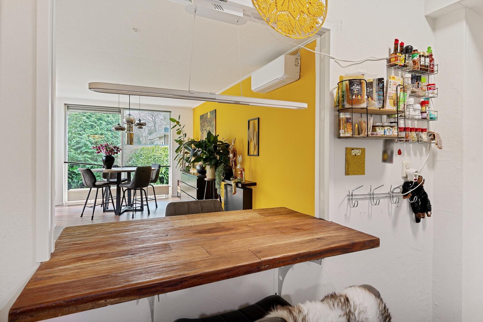 De L-vormige woonkamer is gelegen aan de voorzijde van de woning en biedt zicht op de voortuin en de achtertuin. Vanuit de woonkamer is de half open keuken bereikbaar. De keuken staat in verbinding met de bijkeuken, waar extra berg- en kastruimte aanwezig is. Vanuit de bijkeuken is de achtertuin bereikbaar, met aansluitend een overkapping.