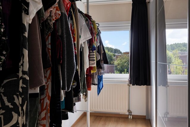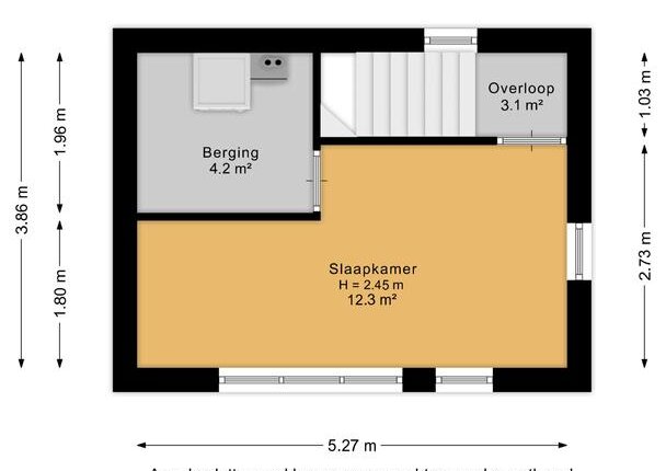 Tweede verdieping: een praktische bergruimte met cv-installatie en witgoedaansluitingen en een slaapkamer.