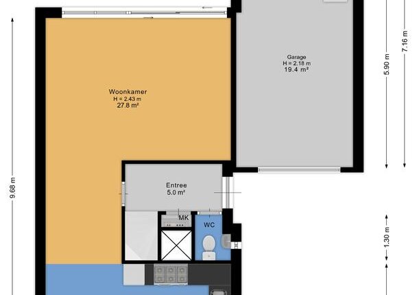 Begane grond: Entree / hal met toilet, de lichte woonkamer met grote raampartijen biedt veel natuurlijk daglicht en geeft directe toegang tot de achtertuin. De open keuken in hoekopstelling, aan de voorzijde gesitueerd, is voorzien van diverse inbouwapparatuur en biedt volop werk- en bergruimte. Via de entree aan de voorzijde of via de tuin aan de achterzijde is de garage bereikbaar en daarachter gelegen is de berging. Ook is daar de tuin gelegen op het zuiden en aan het water.