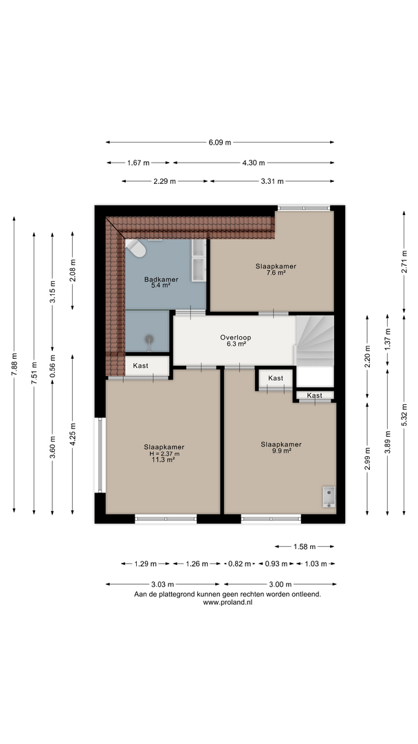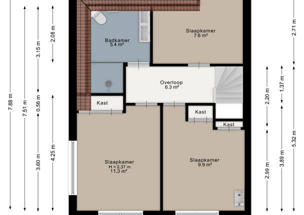 Via de overloop zijn drie slaapkamers en de badkamer bereikbaar. De slaapkamers zijn gelegen aan zowel de voor- als achterzijde van de woning. De badkamer is centraal op de verdieping gesitueerd en bereikbaar vanaf de overloop.